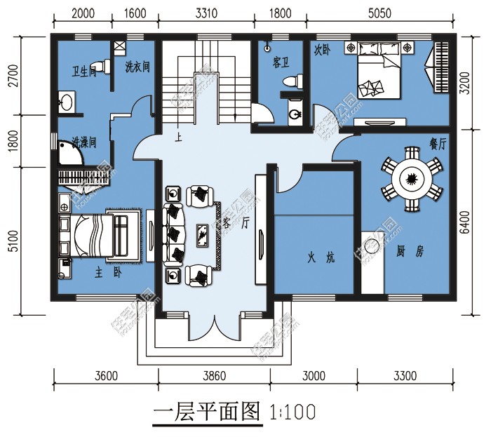 该户型地基东西长14米,南北宽10米,占地面积140平方米,建筑面积220平方米。共设6室2厅3卫1厨1露台